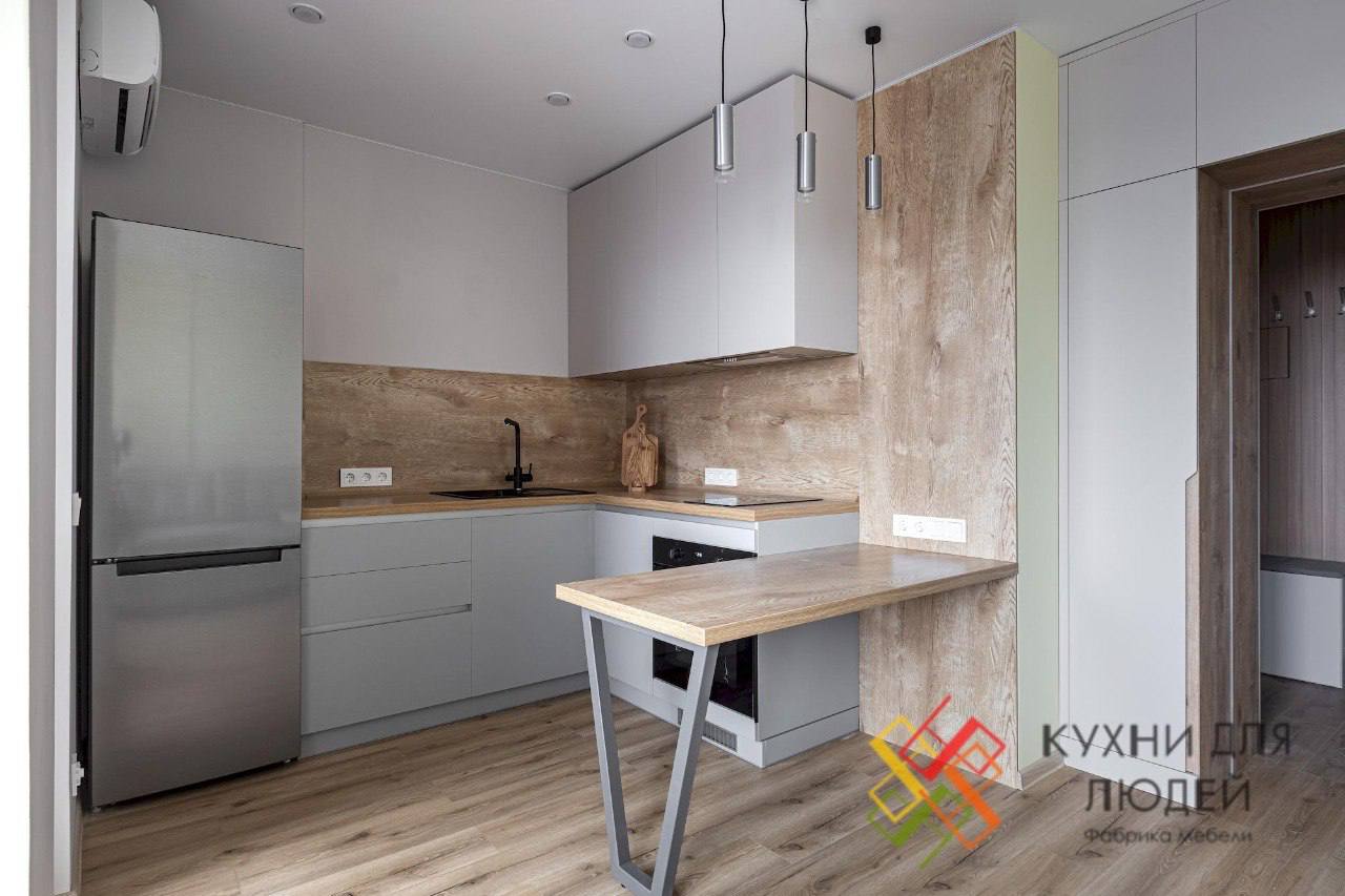 Прямая или угловая кухня с базовой фурнитурой делается быстрее.